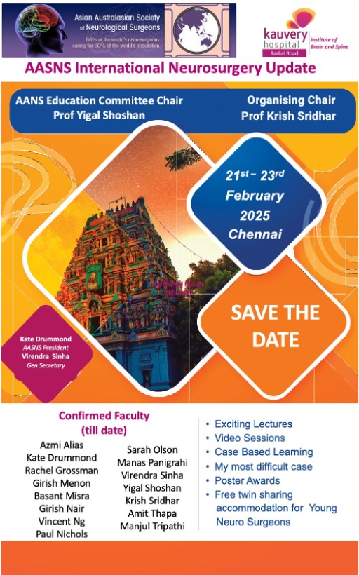 The India Educational and Joint Meetings, scheduled from February 21 to 23, 2025, will take place in Chennai, Tamil Nadu. Organized by Dr. Krish Sridhar, the event highlights a WFNS Foundation Course and is expected to host around 150 participants, building on last year’s successful turnout of over 200 attendees.
